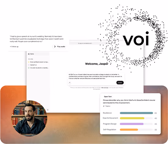 Describe your project and impact goals – voi generates a scientific interview guide in minutes, conducts interviews with the people you serve at scale, and transforms what they say into verified evidence you can act on, share, and be proud of.
